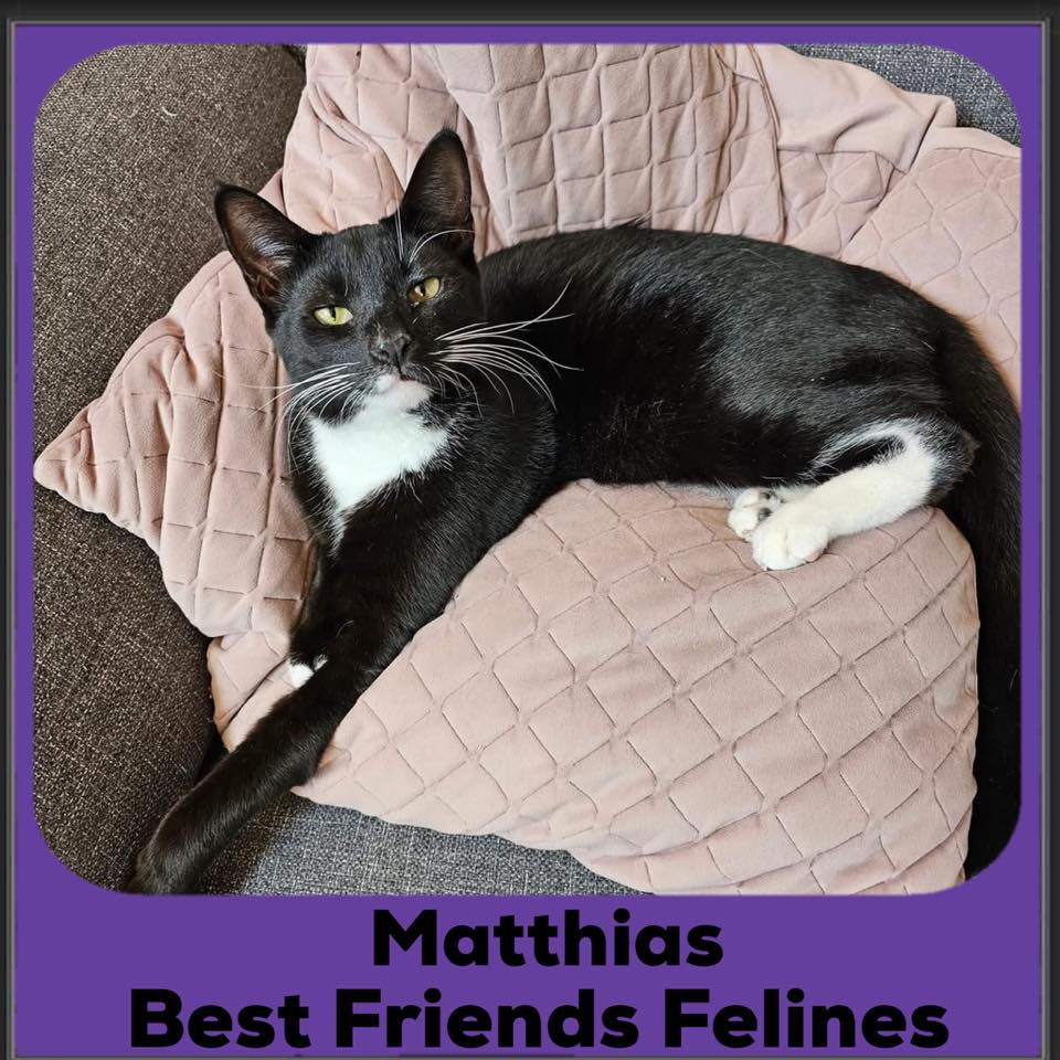 Matthias is a handsome tuxedo with the cutest face and huge green eyes.