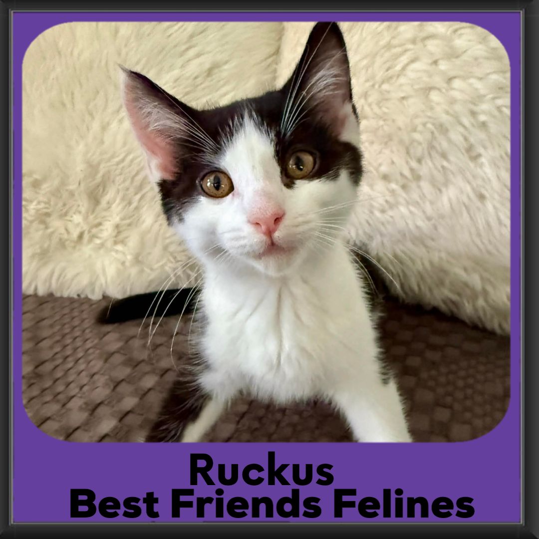 Ruckus is the kind of kitten who brings both fun and comfort into a home. Playful, loving, and easygoing, he would make a wonderful companion for a family looking for a confident little boy with a big heart.