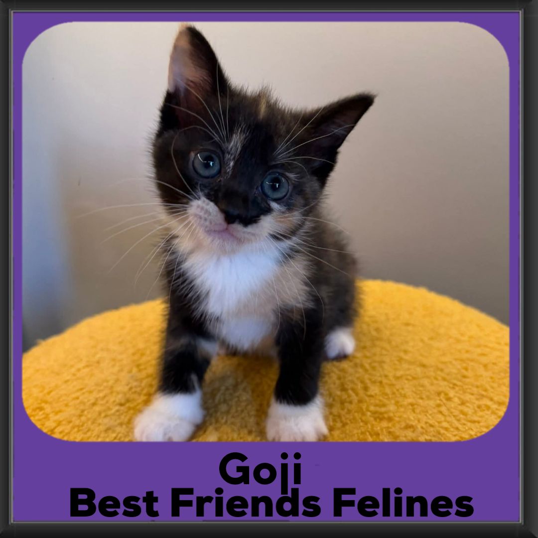 Her pretty little tortie markings and cute white bobby socks make her as adorable as can be. She will keep you entertained with her antics and give all the love in the world.