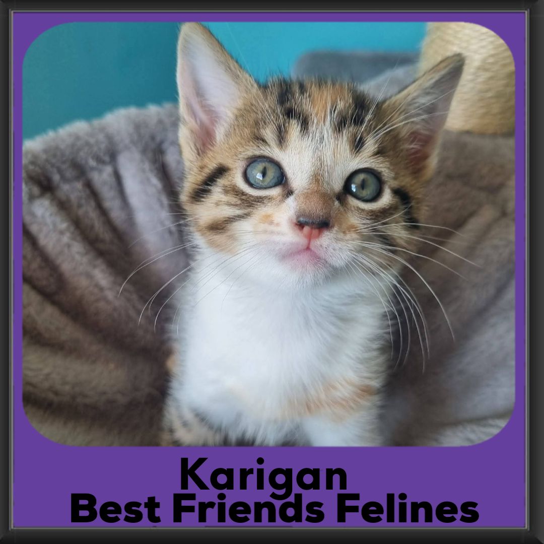 Karigan is a little tabby girl with a few cute splodges of ginger on her face and body.