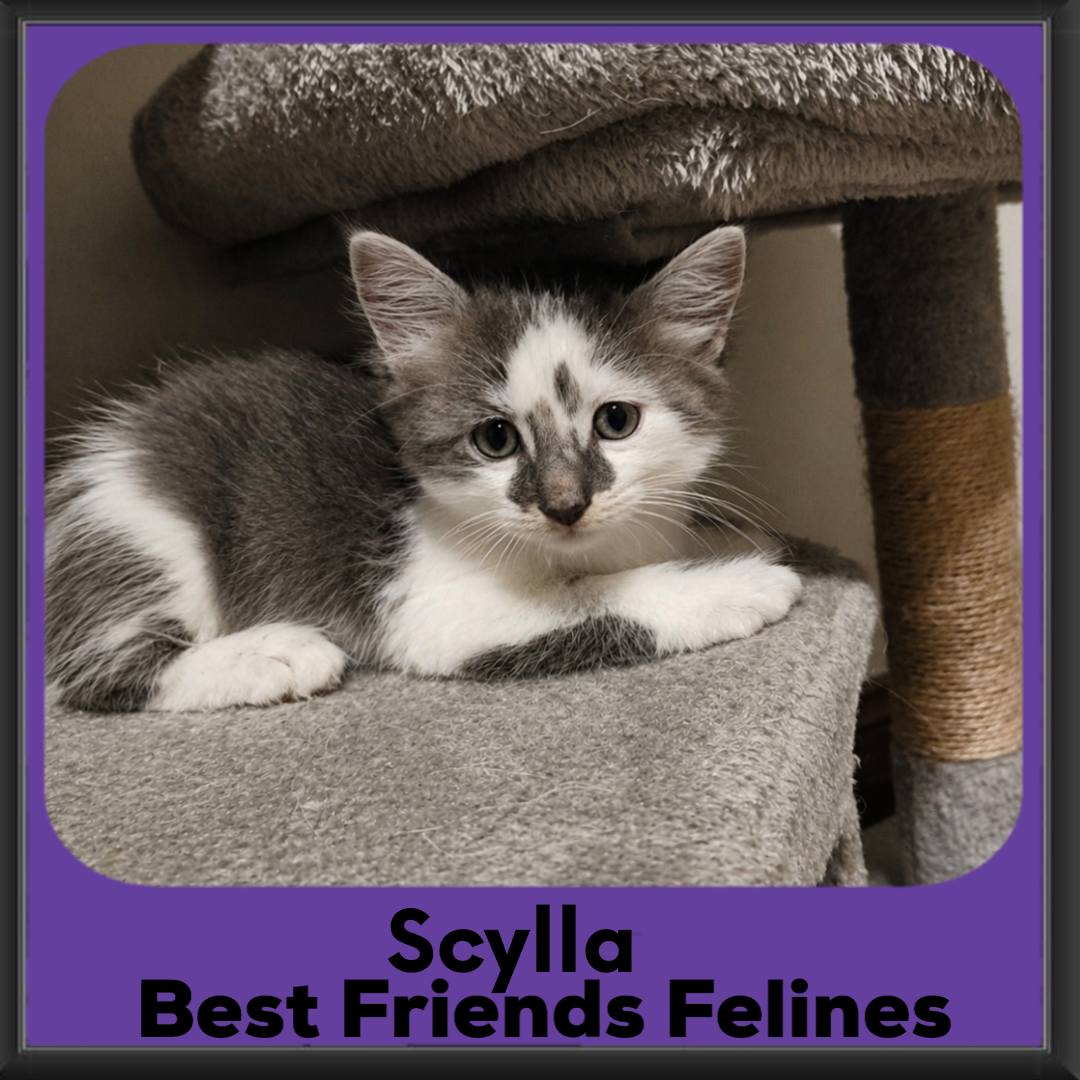 Playful, outgoing, and full of life, Scylla thrives on interaction. She loves chasing toys, leading kitten games, and then winding down with a good cuddle session.