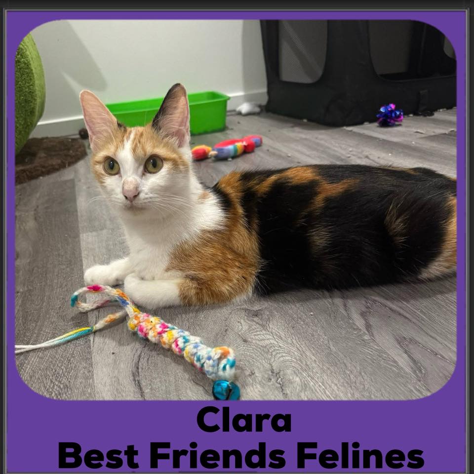 Clair is a stunning calico girl with a big personality and an even bigger voice. She’s an absolute chatterbox, always ready to greet you, tell you about her day, or politely remind you that mealtime is approaching. If you love a cat who truly communicates, Clair is your girl.